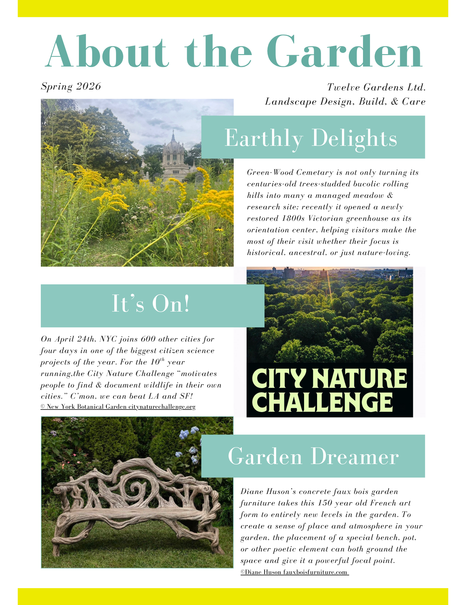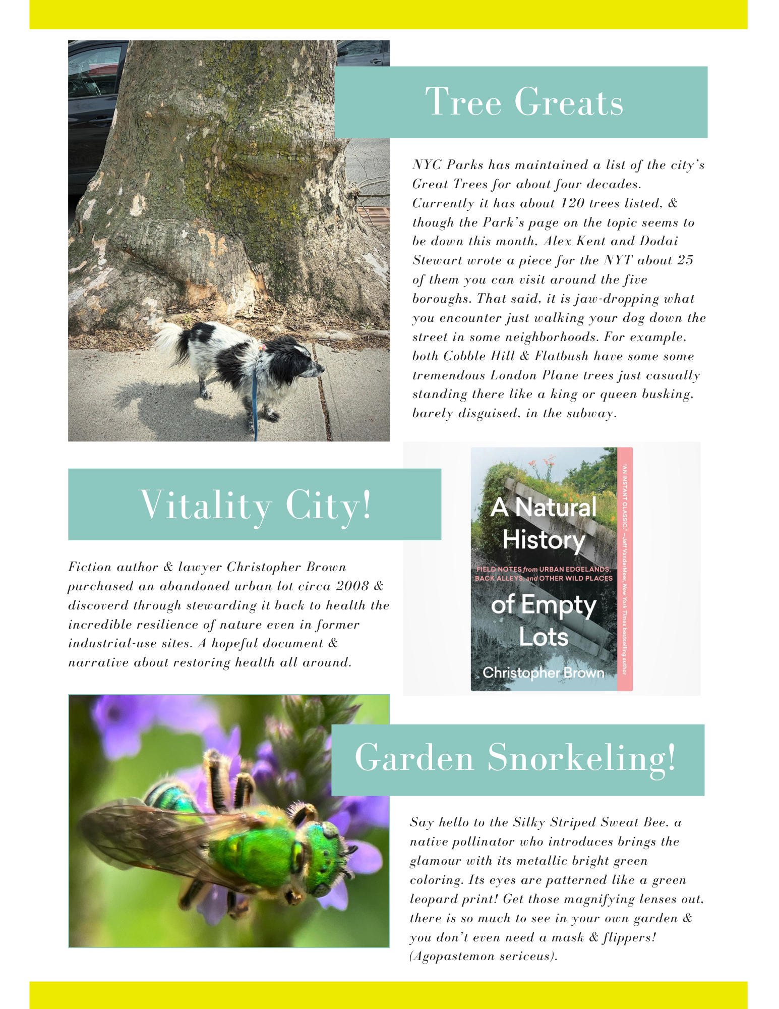 Giant, mythological, and other NYC trees; Let’s beat LA in counting city nature sightings!; Garden furniture . . . or art?; Green bees’ knees.